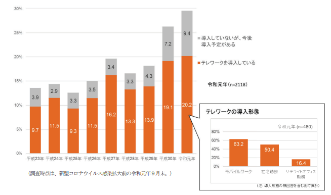 総務省の調査によると、テレワークを導入している企業(20.2%)のうち、モバイルワークを導入している企業は63.2%と大多数を占めます。
